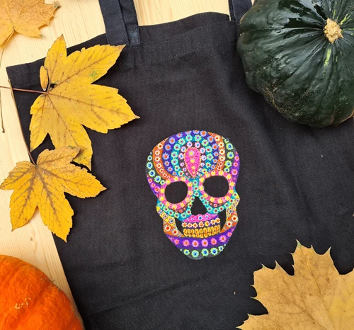 Trick or treat in stijl dit jaar met je zelfgemaakte Halloween tas! Breng deze kleurrijke schedel aan op een zwarte draagtas met Talens Art Creation Textielverf. Gebruik verschillende voorwerpen om een gedetailleerd stippenontwerp te maken of creëer je eigen enge ontwerp! Dit project is leuk om alleen of samen met je gezin te doen.